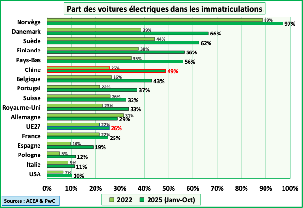 La progression est particulièrement spectaculaire en Chine (de 26% à 49% en 4 ans) mais aussi, en Europe, dans les pays nordiques, aux Pays-Bas mais aussi en Belgique. En Norvège et en Suède, pays de grands espaces, le « range anxiety » n’a pas dissuadé les automobilistes de passer au tout électrique ! La moyenne européenne progresse cependant peu freinée par les grands pays historiquement producteurs d’automobiles : l’Allemagne où la part de la voiture électrique recule de 2022 à 2025, la France et surtout l’Italie. On notera aussi les progrès récents au Royaume-Uni, en Espagne, et au Portugal. Quant à la part dérisoire de la voiture électrique aux USA elle ne surprendra personne.