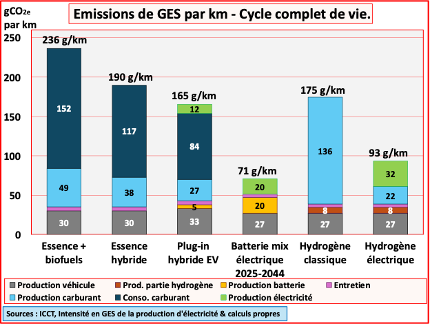 Sur l’ensemble du cycle de vie, les émissions d’une voiture 100% électrique dans l’Union Européenne sont 70% inférieures à celle d’une voiture à essence, 63% à celles d’une voiture à essence « hybride » et 57% à celles d’un véhicule « plug-in hybride ». Elles sont aussi significativement inférieures à celles de véhicules à hydrogène que cet hydrogène soit produit classiquement par vaporeformage de gaz ou par électrolyse (électricité). Sur base du mix électrique français une réduction additionnelle des émissions est observée pour la voiture 100% électrique : 61,0 g/km au lieu de 70,8 g/km pour le mix électrique européen. Quant au surcroît d’émission de GES lié à la production des batteries il est récupéré après 1 an et 8 mois par rapport au moteur thermique traditionnel et en 2 ans et 3 mois par rapport à la voiture à essence « hybride ».