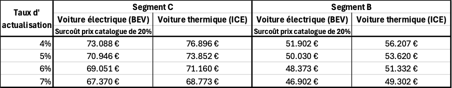 On constate que, à 4% de taux d’actualisation, avec un surcoût de 20% au prix d’achat catalogue la voiture électrique est moins chère que la voiture thermique correspondante. C’est aussi le cas si le surcoût à l’achat monte à 30%. A 7% de taux d’actualisation, la voiture électrique reste moins chère avec un surcoût de 20% au prix d’achat catalogue. Il faut monter à un surcoût de 30% pour que la voiture thermique du segment C soit moins chère que la voiture électrique.