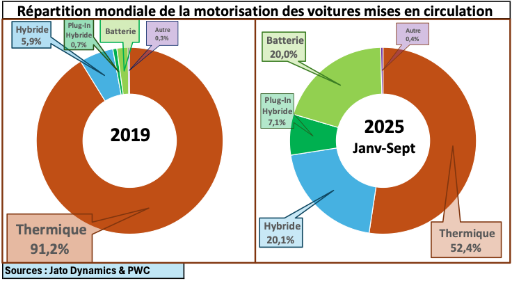 Les patrons de l’industrie automobile européenne tous comme les décideurs politiques feraient bien de s’inspirer de Schumpeter avant d’appeler au report de l’abandon de la vente de véhicules thermiques. Tout comme les décideurs politiques avant de se prononcer sur le sujet. Car les faits parlent d’eux-mêmes comme l’illustre le graphique de la motorisation des véhicules neufs mis sur la route en 2019 et en 2025 (9 premiers mois).