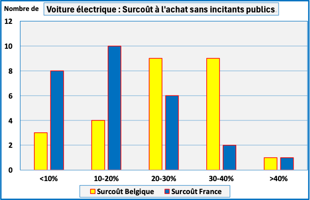 En synthèse, le surcoût catalogue des voitures électriques par rapport aux voitures thermiques a considérablement diminué même sans incitants publics : le surcoût pour de nombreux modèles est inférieur à 15% en France et à 25% en Belgique. En France, avec les incitants publics applicables fin 2025 de nombreux modèles électriques ont un coût inférieur au modèle thermique correspondant et un large choix existe avec un surcoût de moins de 10%.