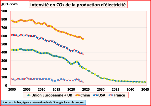 La décarbonation de la production d’électricité et, plus encore, son évolution future, sont des éléments essentiels de la modélisation directement pour les émissions liées à l’usage et indirectement pour celles liées à la production des batteries qui est intensive en électricité. La production d’électricité en Europe est déjà largement décarbonée (dans mes conférences et interventions je constate souvent que la plupart de mes auditeurs sous-estiment fortement cette évolution positive). C’est ainsi qu’en 2024 70,6% de l’électricité produite dans l’Union Européenne et au Royaume-Uni était décarbonée (35,7% par les nouveaux renouvelables, 22,7% par le nucléaire et 12,1% par l’hydro-électricité) et seulement 28,8% était d’origine fossile (dont 15,6% par le gaz et 9,8% par le charbon). L’évolution a été rapide et elle se poursuit rapidement : le graphique ci-après montre cette évolution des émissions par kWh pour le seul CO2 pour l’ensemble Union Européenne + Royaume-Uni, la Chine, les USA et la France (les émissions des autres gaz à effet de serre augmentent le niveau de 10 à 12%). Pour l’évolution future nous avons retenu le scénario le moins favorable entre l’Agence Internationale de l’Energie, le Centre de Recherche Commun (JRC) et l’Association des gestionnaires de réseau de transport d’électricité (ENTSO-E).