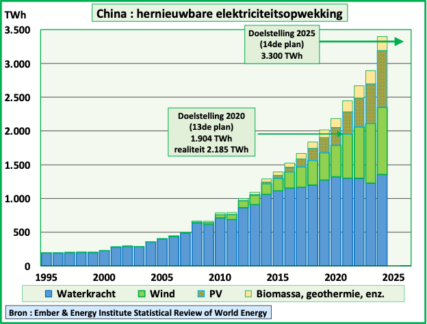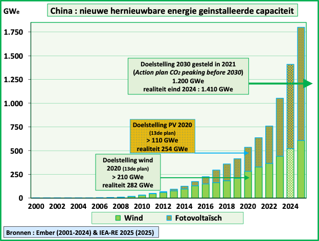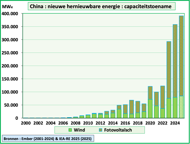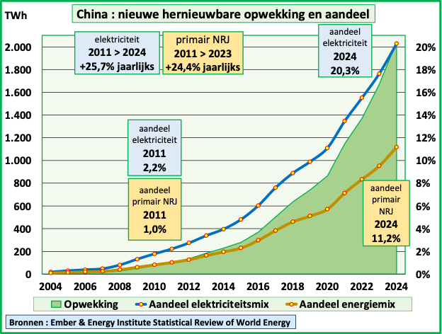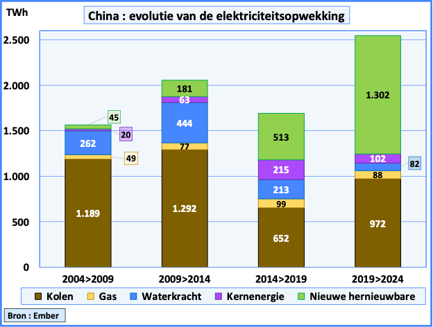 Van 2009 tot 2014 droegen nieuwe hernieuwbare energiebronnen slechts voor 8,8% bij aan de groei van de productie (63% voor steenkool en 22% voor waterkracht). Van 2014 tot 2019 stijgt de bijdrage van nieuwe hernieuwbare energiebronnen tot 30,3% (38,6% voor steenkool en 12,6% voor waterkracht). Ten slotte bedraagt de bijdrage van nieuwe hernieuwbare energiebronnen tussen 2019 en 2024 51% (13 keer meer dan kernenergie) en die van steenkool 43,6%. Sterker nog, in de eerste helft van 2025 is de toename van de productie van fotovoltaïsche energie (+168 TWh, wat overeenkomt met 48 kernreactoren) en windenergie (79 TWh) samen groter dan de toename van de vraag (+198 TWh). Als we daar de toename van de kernenergieproductie (+24 TWh) en de ontwikkeling van andere bronnen aan toevoegen, daalt de productie uit steenkool (-56 TWh). Voor het eerst daalt de CO2-uitstoot van China voor de elektriciteitsproductie.