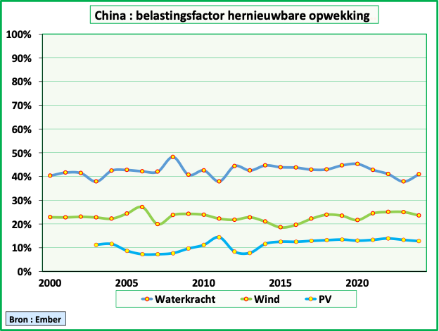 De belastingsfactor (effectieve productie gedeeld door de theoretische maximale permanente productie) meet de operationele prestaties van Chinese hernieuwbare energiebronnen. Met meer dan 40% voor waterkracht op lange termijn en regelmatige stijgingen voor windenergie (25,0% in 2023 en 23,6% in 2024) en fotovoltaïsche zonne-energie (13,3% in 2023 en 12,8% in 2024), voldoen de prestaties aan de internationale normen.