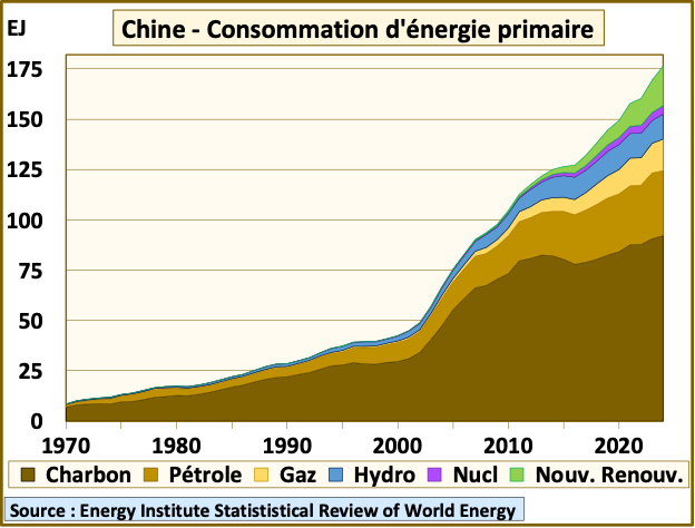 La dominance du charbon en Chine saute aux yeux tout comme le fait que la consommation d’énergie par habitant y a dépassé la moyenne mondiale pour atteindre en 2024 le niveau européen. La consommation de charbon par habitant est en Chine 7 fois la consommation en Europe (ce qui illustre la sortie rapide du charbon en Europe), plus de 3 fois la moyenne mondiale et 3 fois la moyenne par nord-américain !