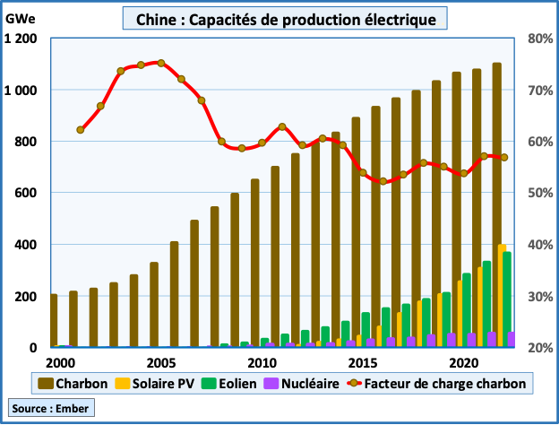 Le graphique met en évidence la large dominance du charbon en particulier jusqu’en 2015. Au début de la décennie 2000 les capacités augmentent lentement et le facteur de charge (axe de droite) atteint des maxima (plus de 75%). A partir de 2005 les capacités augmentent rapidement (doublement en 7 ans) et le facteur de charge descend à 60%. L’augmentation des capacités est plus lente à partir de 2015 (+24% de 2015 à 2022) avec, simultanément, une augmentation des capacités en solaire, éolien et nucléaire. Depuis 2015 le facteur de charge des centrales au charbon se situe entre 50% et 60%.