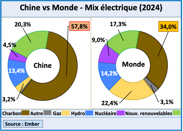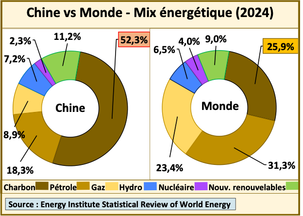 Le mix énergétique chinois est donc très largement déséquilibré par rapport au mix mondial. Le charbon y pèse plus de deux fois plus que dans le monde. Et si l’hydro-électricité et les nouveaux renouvelables y pèsent (un tout petit peu) plus que dans le monde, le recours au pétrole et au gaz y est nettement moins important.